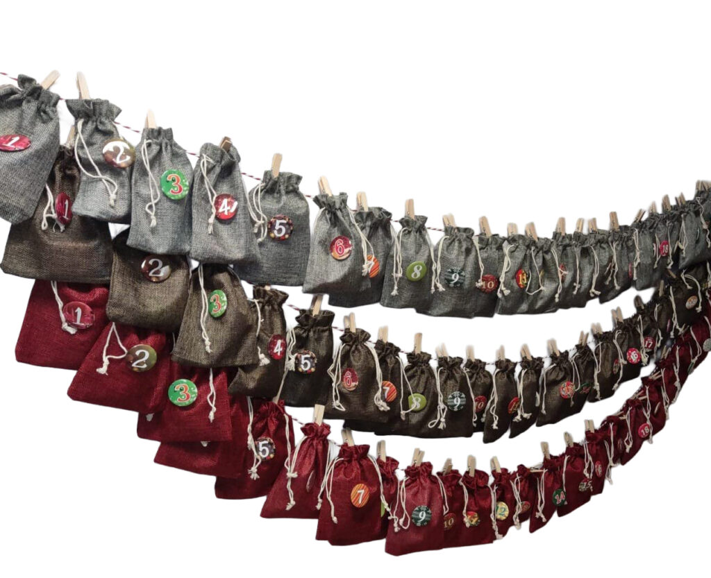 Letztes Jahr dachte ich mir so, ich besorg mal einen Adventskalender mit diesen Jutesäckchen. Kam an, ich mach das Paket auf und dann – 25 Säckchen? Hab echt erstmal gedacht die haben sich verzählt bei der Fabrik oder so. Aber ist eigentlich praktisch, falls eins kaputtgeht hat man Ersatz.